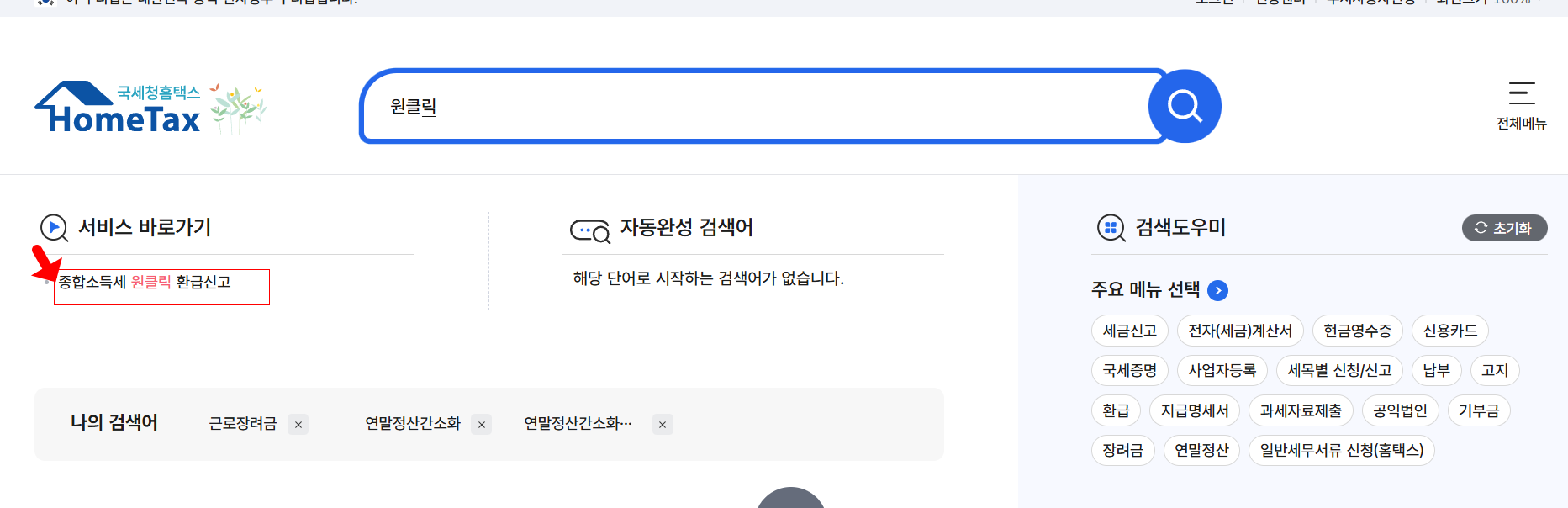 홈 화면 또는 ‘My 홈택스 → 환급신청’ 경로에서 ‘원클릭 환급 신청’ 메뉴를 클릭합니다.