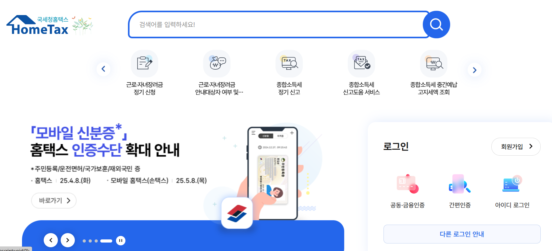 가장 먼저, 국세청 홈택스 사이트(https://www.hometax.go.kr)에 접속합니다.