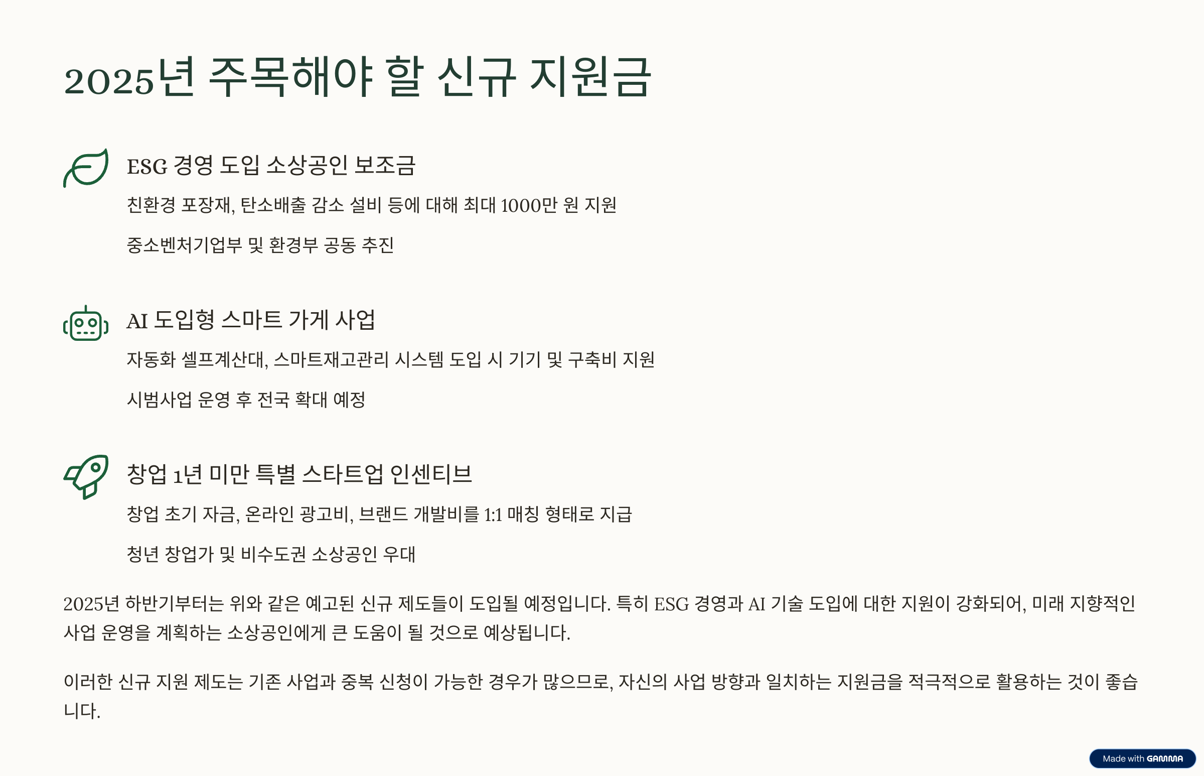 2025년 정부 예산안과 중소벤처기업부, 소진공(소상공인시장진흥공단) 발표에 따르면 아래와 같은 주요 지원금이 운영 중입