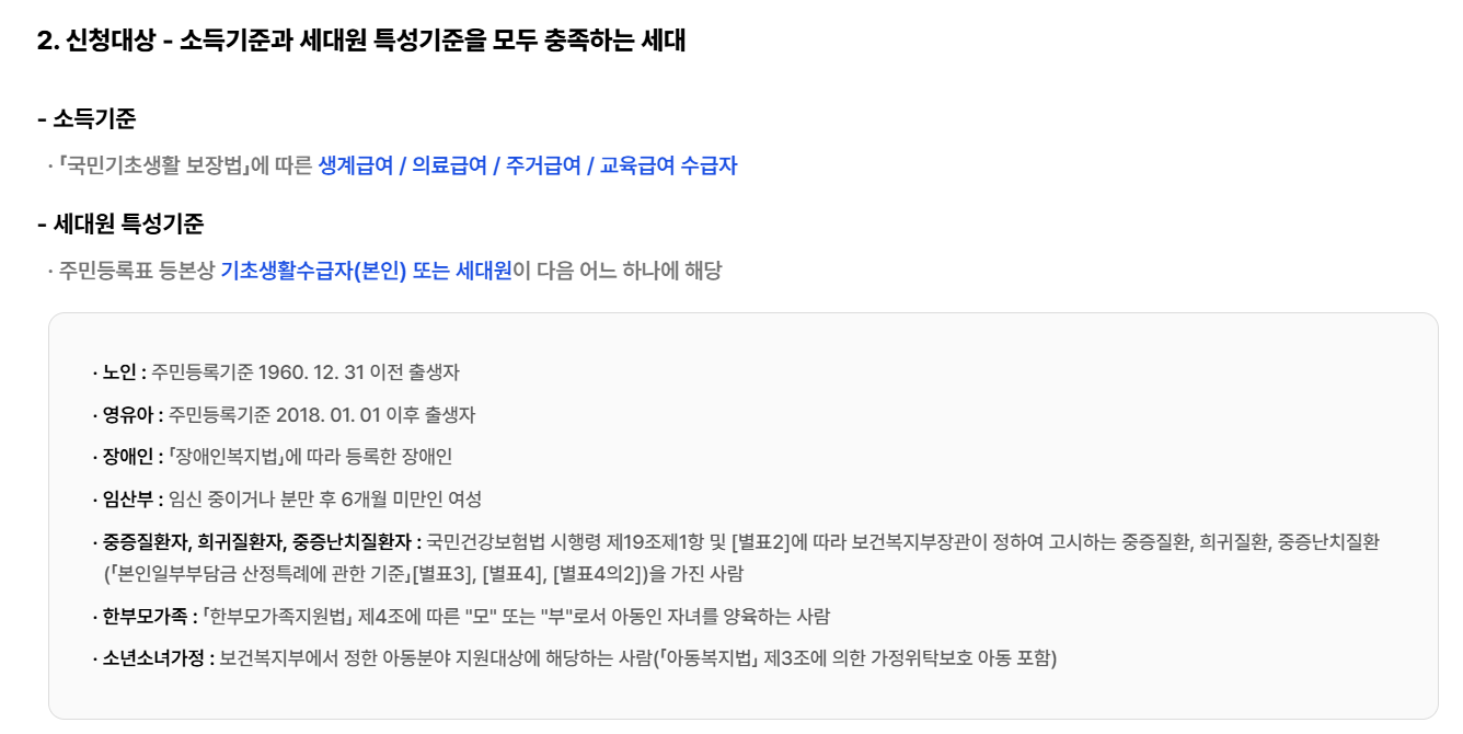 먼저, 국민기초생활보장법상 생계급여, 의료급여, 주거급여, 교육급여 수급자가 기본 대상이에요. 여기에 노인(1960년 12월 31일 이전 출생자), 영유아(2018년 1월 1일 이후 출생자), 장애인, 임산부, 중증 및 희귀·난치질환자, 한부모가정, 소년소녀가정 중 한 가지 조건이라도 해당하면 지원받을 수 있습니다.