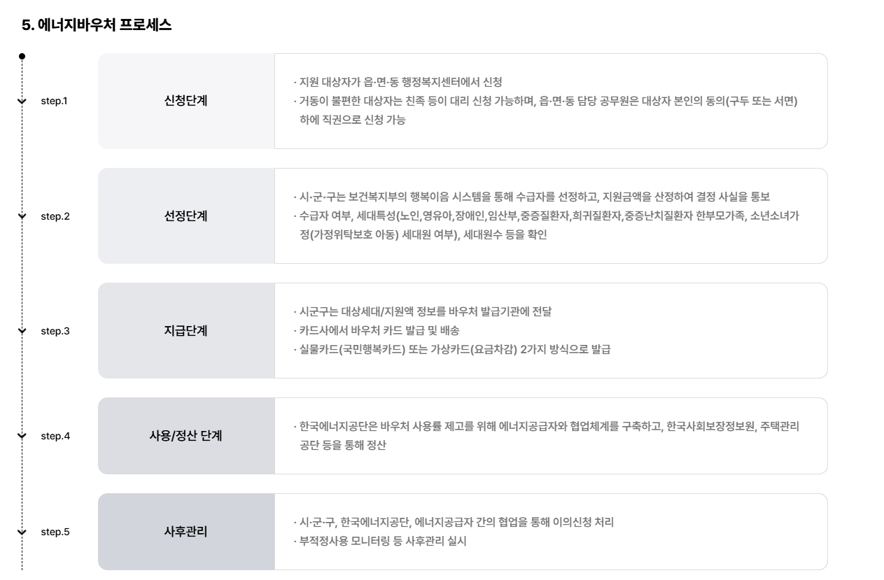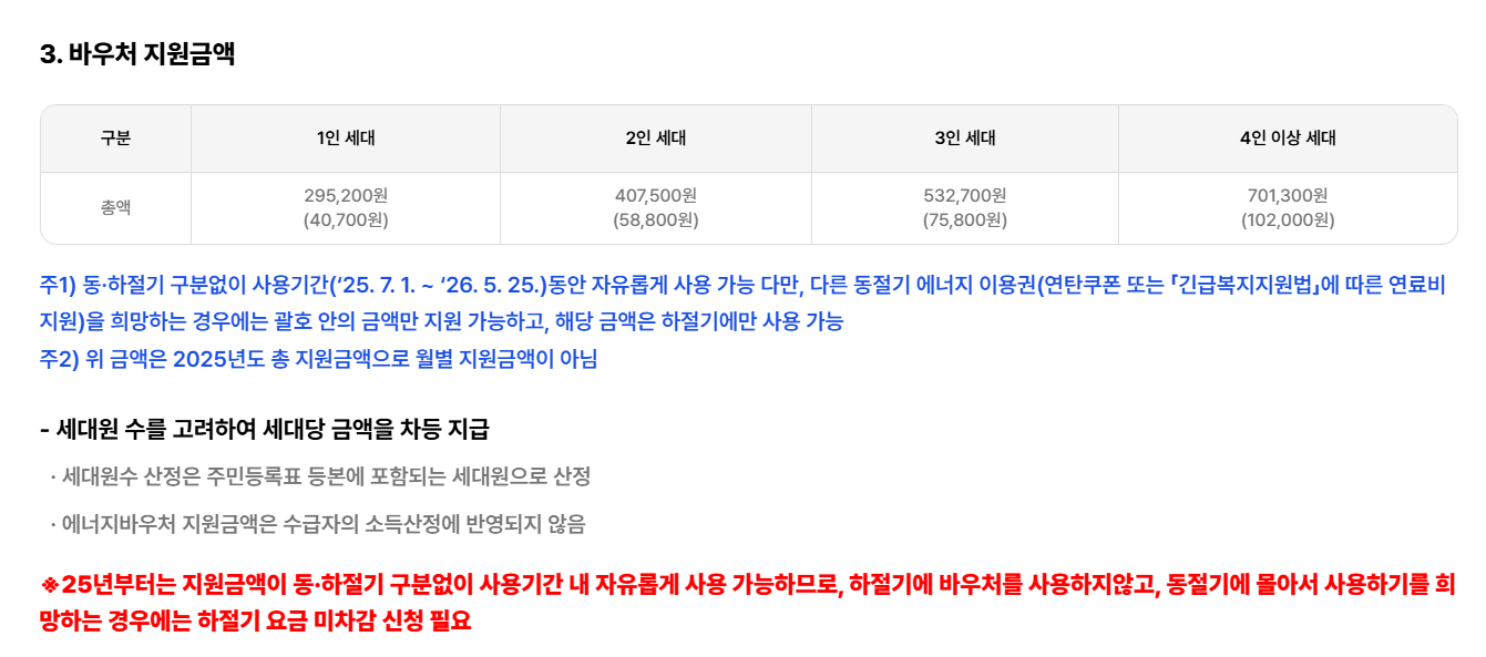 단, 모든 세대원이 보호시설에 입소 중이거나 동일 목적의 지원(연탄쿠폰 등)을 이미 받고 계신 경우에는 제외됩니다. 그렇기 때문에 에너지바우처 신청 대상 자격이 되는지 사전에 꼼꼼하게 확인하시는 것이 중요해요.
