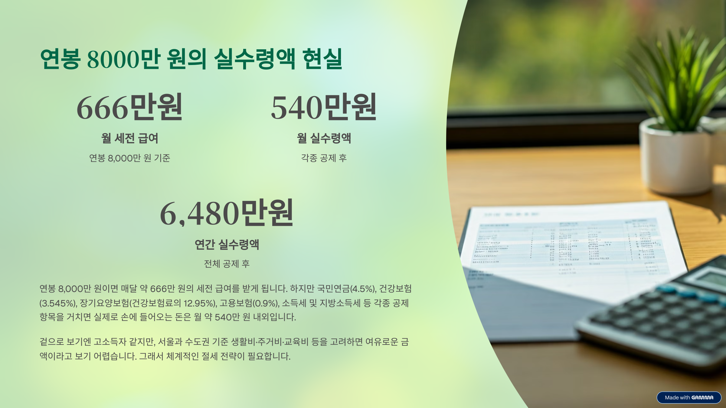 연봉 8,000만 원이면 매달 약 666만 원의 세전 급여를 받게 됩니다. 하지만 각종 공제 항목을 거치면 실제로 손에 들어오는 돈은 월 약 540만 원 내외입니다.