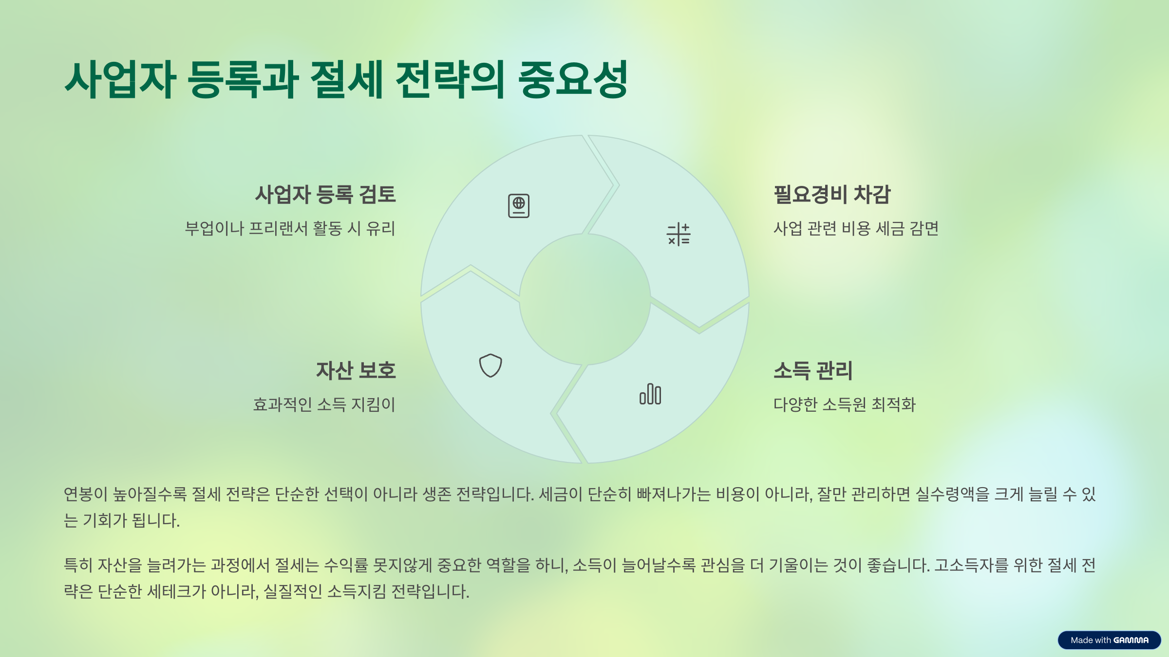 부부 공동명의 자산 분배, 배우자에게 일부 소득 귀속, 가족 간 적절한 계좌 분리 등도 절세에 효과적입니다. 특히 고소득자의 경우 부동산 임대소득 등을 분산하는 전략이 실효성 있습니다. - 사업자 등록 여부 검토