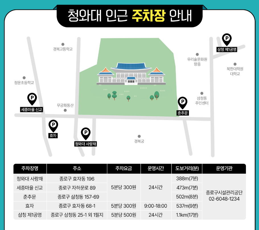 자차 이용도 가능하지만, 청와대 내부에는 별도 주차장이 없습니다. 대신 사랑채 공영주차장을 이용해야 해요. 이곳은 5분당 300원의 주차 요금이 부과되며, 다음과 같은 할인 혜택도 있습니다.