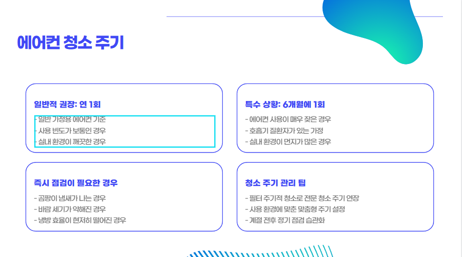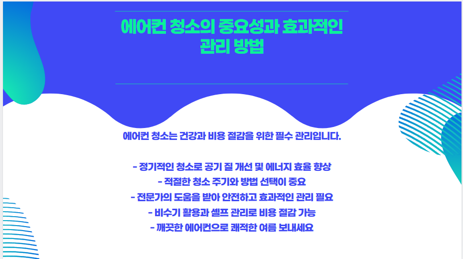 에어컨 청소는 선택이 아닌 필수입니다. 특히 여름철 건강을 위해 꼭 챙겨야 할 관리 항목 중 하나입니다. 믿을 수 있는 업체나 공식 서비스를 통해 안전하게 점검해보세요.