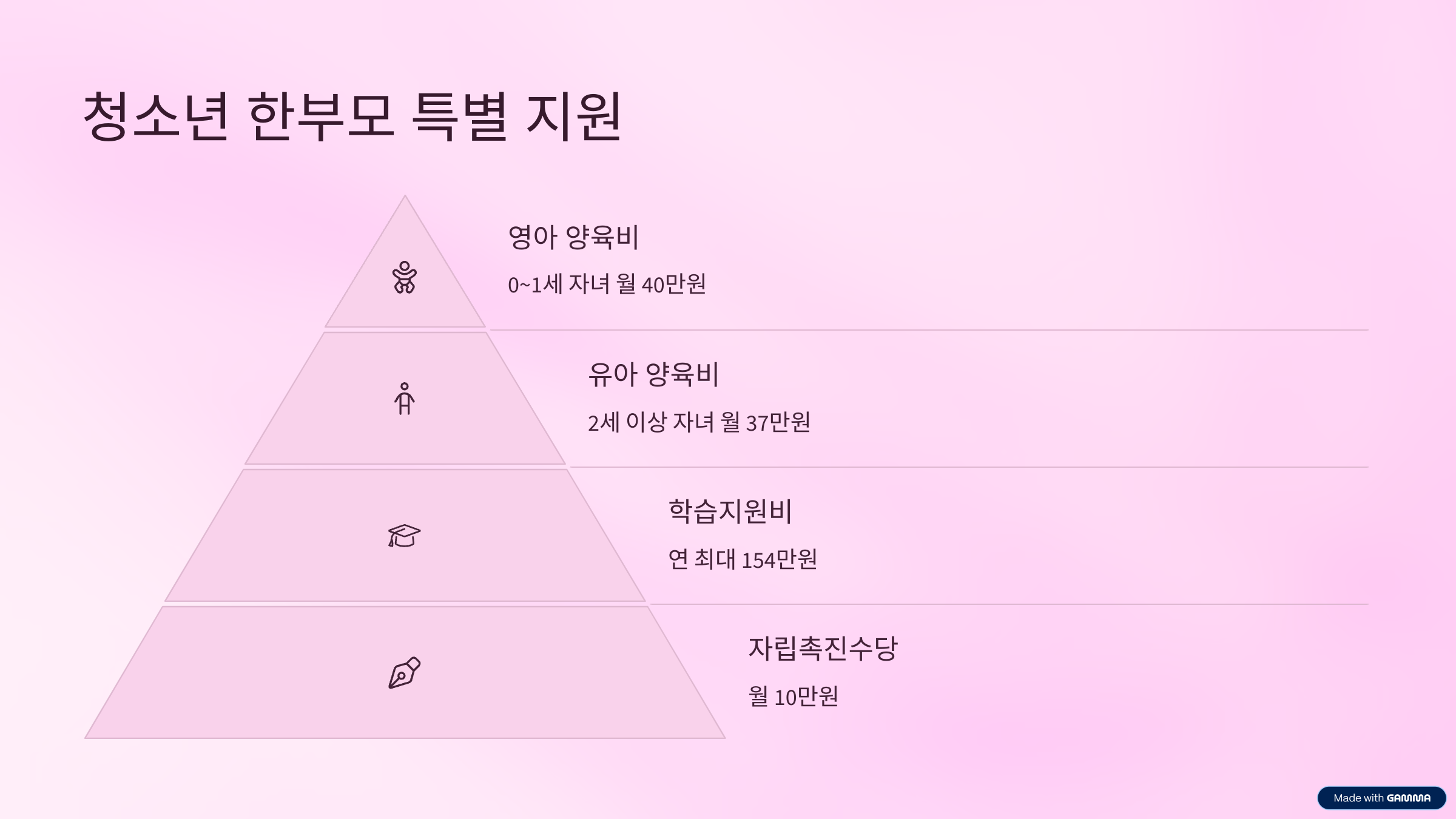 만 24세 이하 청소년 한부모는 추가적인 지원을 받을 수 있습니다. 특히 0~1세 자녀에 대해 월 40만 원, 2세 이상 자녀에게는 월 37만 원의 양육비가 지급되어 일반 한부모보다 더 높은 금액을 지원받습니다. 여기에 자립촉진수당 월 10만 원, 학습지원비 연 최대 154만 원도 추가됩니다. 검정고시 준비나 자격증 취득 등 자립을 위한 교육 과정에 유용한 제도입니다.